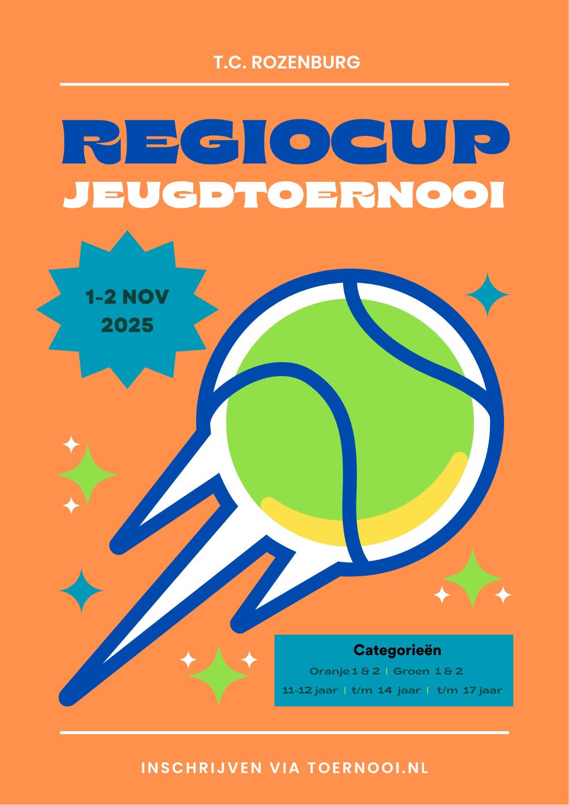 As zaterdag & zondag zal de strijd losbarsten om de felbegeerde regiocup op het tennispark van TC Rozenburg. Zaterdag om 09:00 beginnen de jongste clubkampioenen van de regio in de categorieën oranje 1 & 2, dit event zal tot +/- 12:00 uur duren. Daarnaast zal er ook in andere categorieën gestreden worden.